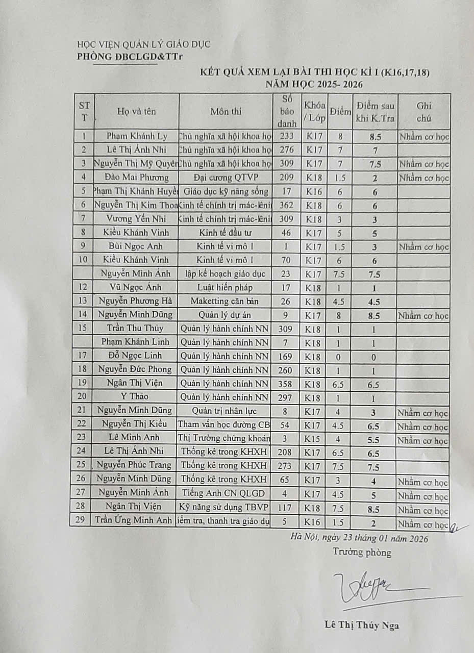 Thông báo kết quả xem lại bài thi học phần kỳ I (năm học 2025-2026) Khóa 16,17,18.