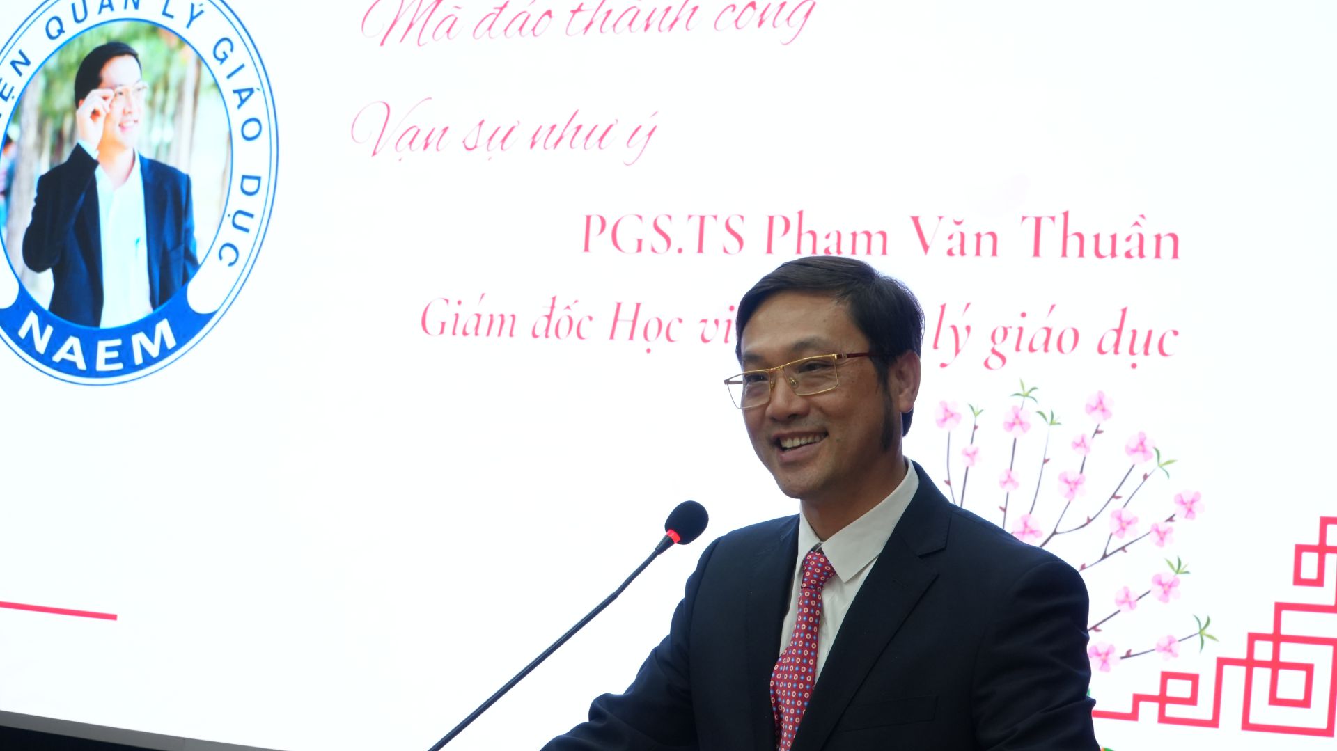 Thay mặt cho tập thể sư phạm của Học viện Quản lý giáo dục, PGS.TS Phạm Văn Thuần, Giám đốc Học viện đã gửi lời chúc sức khỏe, niềm vui và hạnh phúc đến cán bộ, giảng viên, viên chức, người lao động và tất cả các em sinh viên, các anh, chị học viên, nghiên cứu sinh của Học viện, đồng thời muốn gửi “Thông điệp” đầu năm mới Bính Ngọ: “Mã Đáo Thành Công” đến tất cả các thành viên của đại gia đình Học viện Quản lý giáo dục; Cùng nhau Đoàn kết, cùng nhau cam kết xây dựng và thực hiện các giá trị cốt lõi của Học viện: Trách nhiệm – Chuyên nghiệp - Hợp tác để chung tay, quyết tâm thực hiện thắng lợi mọi nhiệm vụ chính trị mà Học viện đã đề ra, hướng tới tổ chức thành công sự kiện 50 Ngày truyền thống thành lập Học viện Quản lý giáo dục (01/10/1976 – 01/10/2026). Năm 2026 là năm khởi đầu của chặng đường mới với nhiều thời cơ và thách thức đối với Học viện khi thực hiện chủ trương sắp xếp lại cơ cấu các cơ sở giáo dục đại học công lập, đẩy mạnh thực hiện cơ chế tự chủ của cơ sở giáo dục đại học, nhưng với tinh thần quyết tâm “chỉ bàn làm, không bàn lùi” tập thể cán bộ, giảng viên, viên chức, người lao động và người học sẽ thu được nhiều thành công mới, thắng lợi mới trong “Kỷ nguyên vươn mình” của đất nước.