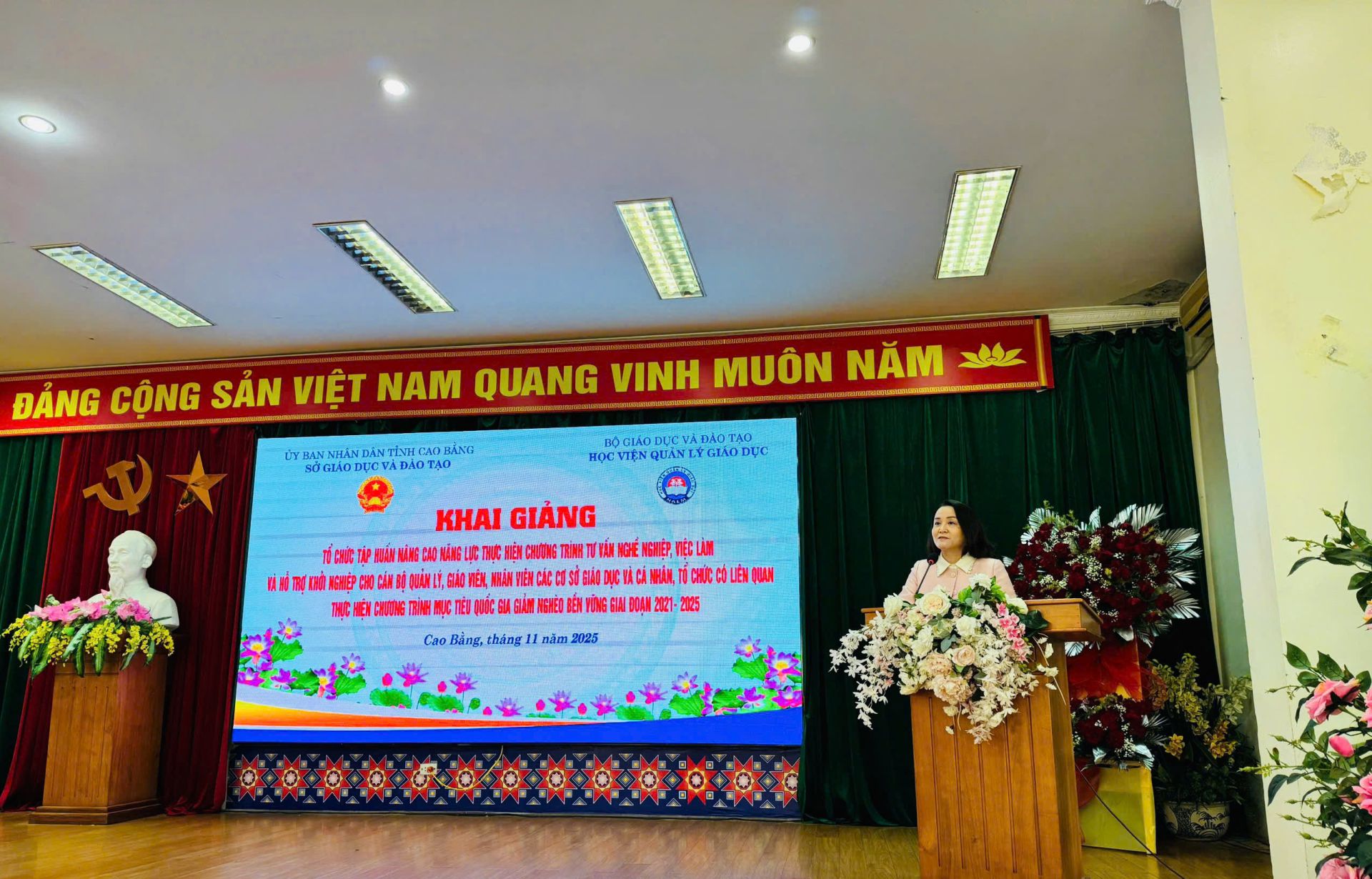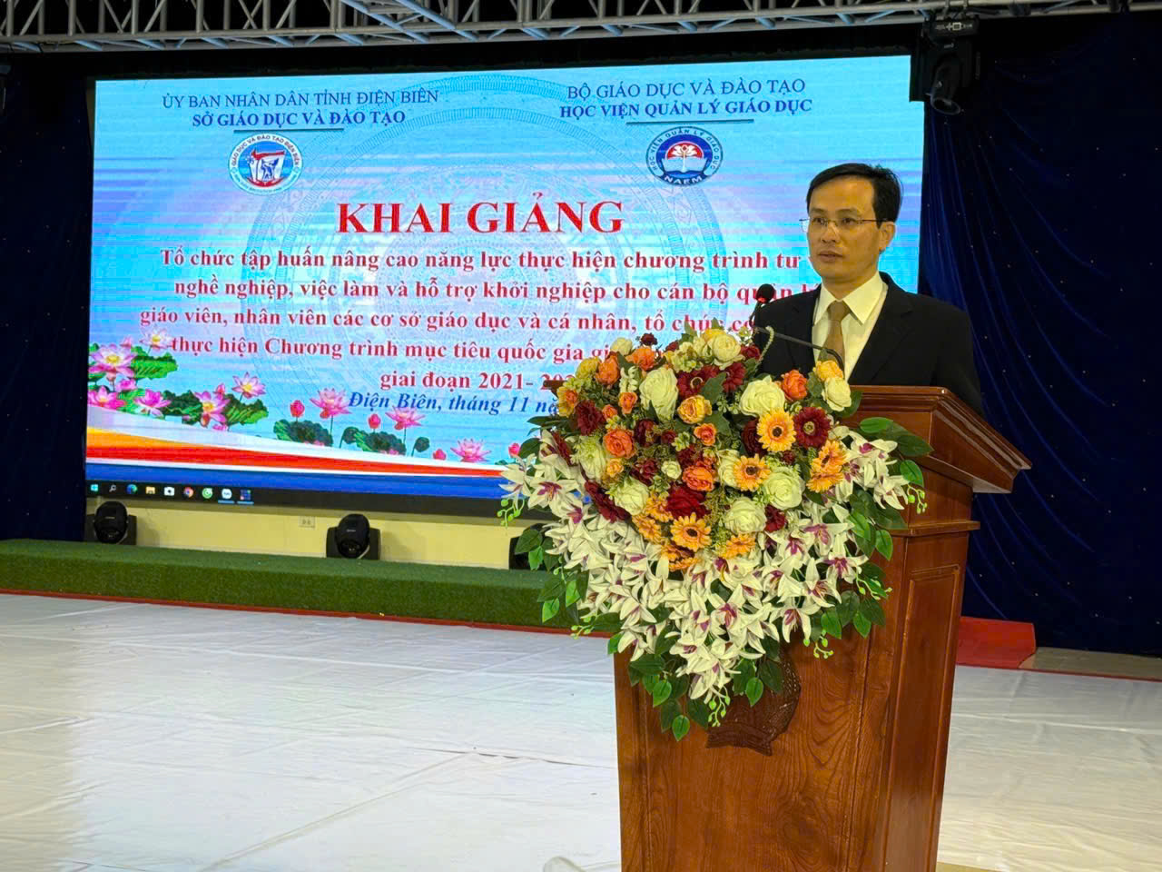 Tại Sở Giáo dục và Đào tạo Điện Biên và Sở Giáo dục và Đào tạo Cao Bằng, Học viện Quản lý giáo dục long trọng tổ chức khai giảng khóa tập huấn nâng cao năng lực thực hiện chương trình tư vấn nghề nghiệp, việc làm và hỗ trợ khởi nghiệp cho cán bộ quản lý, giáo viên, nhân viên các cơ sở giáo dục và cá nhân, tổ chức có liên quan thực hiện Chương trình mục tiêu quốc gia giảm nghèo bền vững giai đoạn 2021–2025.