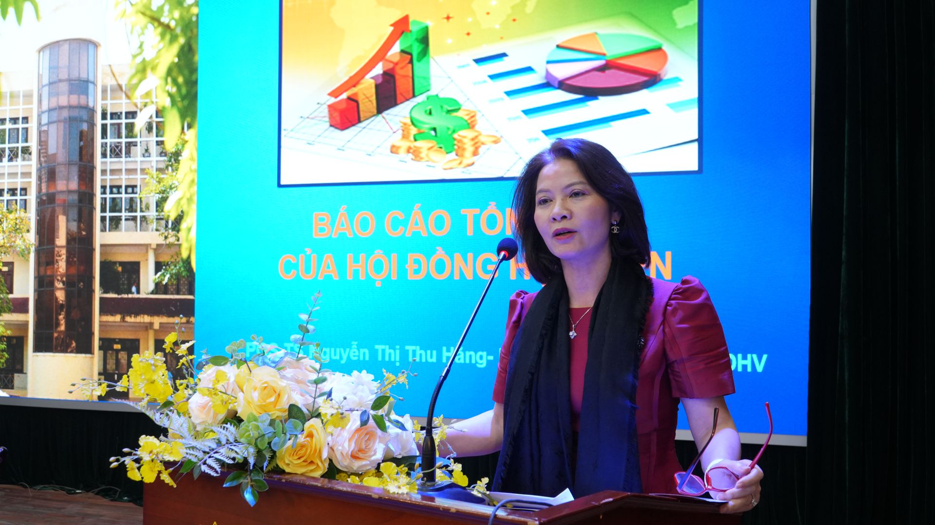PGS.TS Nguyễn Thị Thu Hằng, Chủ tịch Hội đồng Trường Học viện Quản lý Giáo dục, thay mặt Hội đồng Học viện trình bày Dự thảo Báo cáo tổng kết công tác năm học 2024 – 2025; đồng thời đánh giá những kết quả nổi bật mà Hội đồng Học viện đã đạt được trong nhiệm kỳ 2020 – 2025, góp phần tạo nên sự phát triển và thành công của Học viện trong giai đoạn 2020 – 2025.