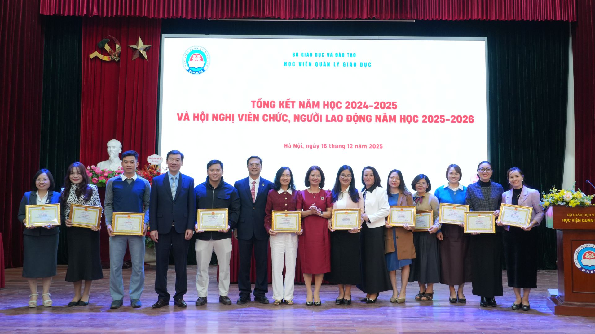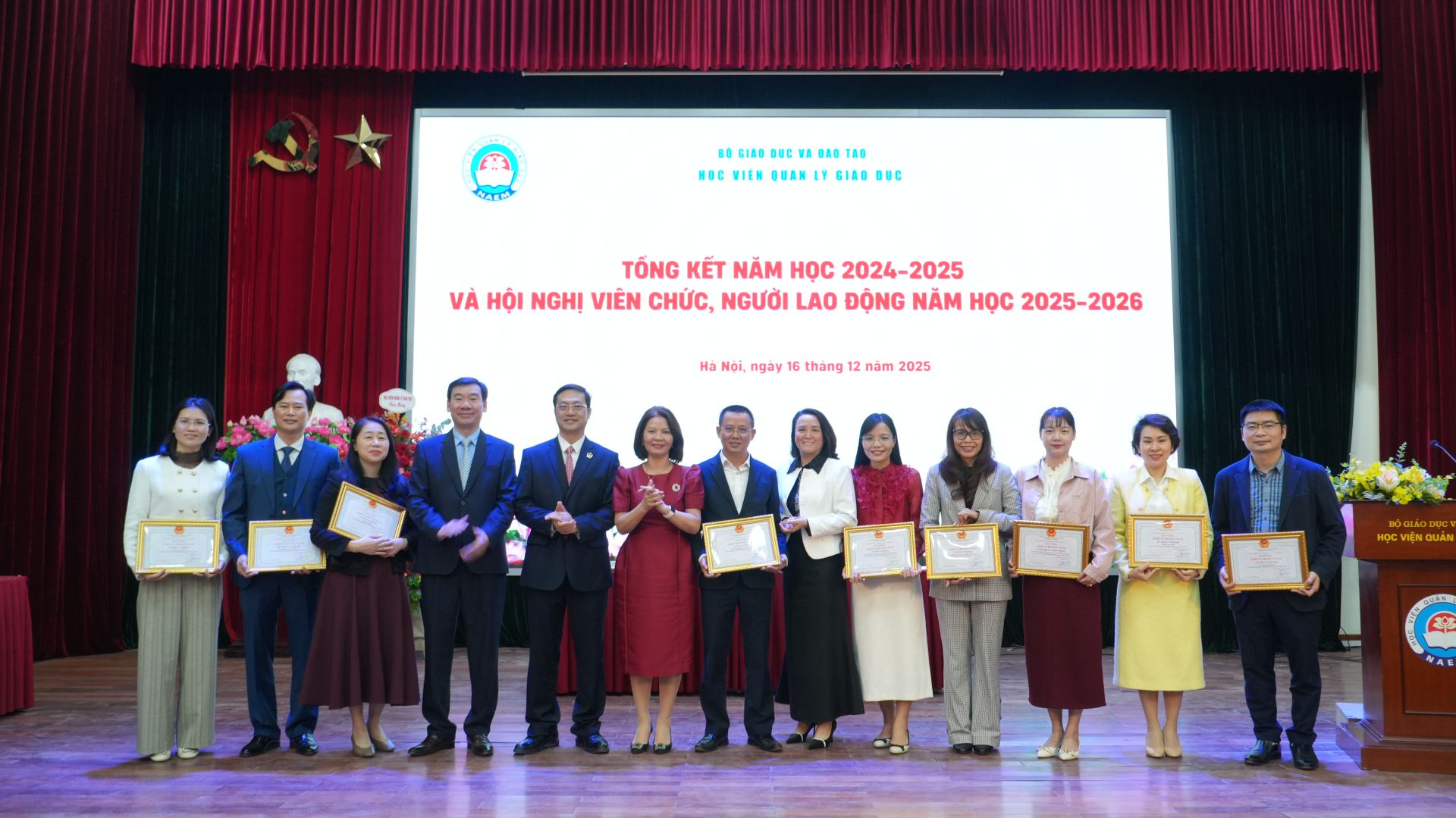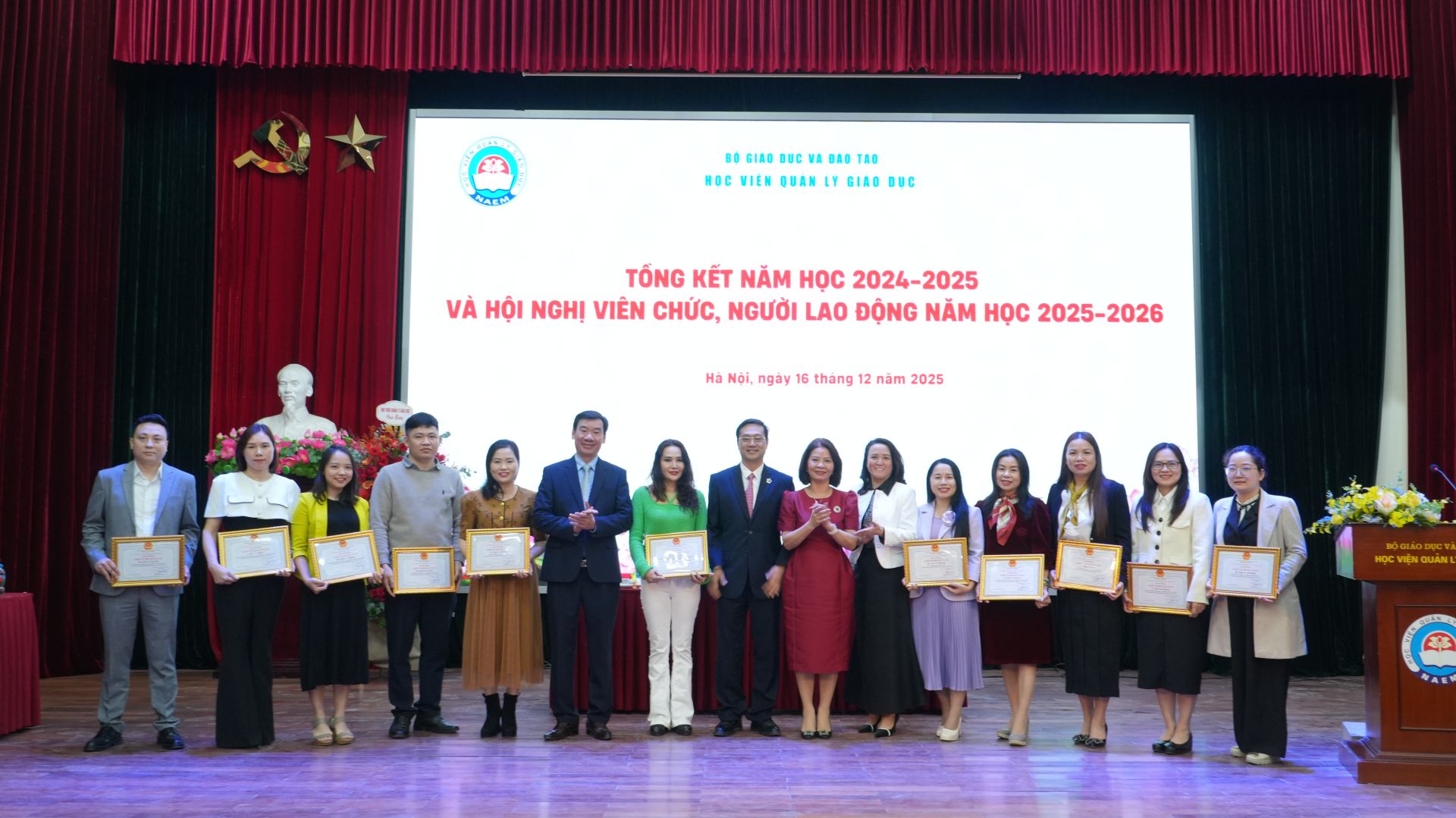 Ngày 16/12/2025, Học viện Quản lý Giáo dục tổ chức Hội nghị Tổng kết năm học 2024 – 2025 và Hội nghị viên chức, người lao động năm học 2025 – 2026 nhằm đánh giá những kết quả đã đạt được, những nội dung chưa đạt còn hạn chế; phân tích nguyên nhân, rút ra các bài học kinh nghiệm trong thực hiện nhiệm vụ không chỉ của một năm học mà còn của năm học kết thúc giai đoạn 2020 – 2025 trong Kế hoạch chiến lược phát triển Học viện giai đoạn 2020 – 2030, tầm nhìn đến năm 2035. Trên cơ sở đó, Hội nghị triển khai xây dựng phương hướng, nhiệm vụ trọng tâm năm học 2025 – 2026 – năm học khởi đầu giai đoạn mới 2025 – 2030, đồng thời cũng là năm học Học viện tổ chức các hoạt động hướng tới kỷ niệm 50 năm xây dựng và phát triển (01/10/1976 – 01/10/2026).