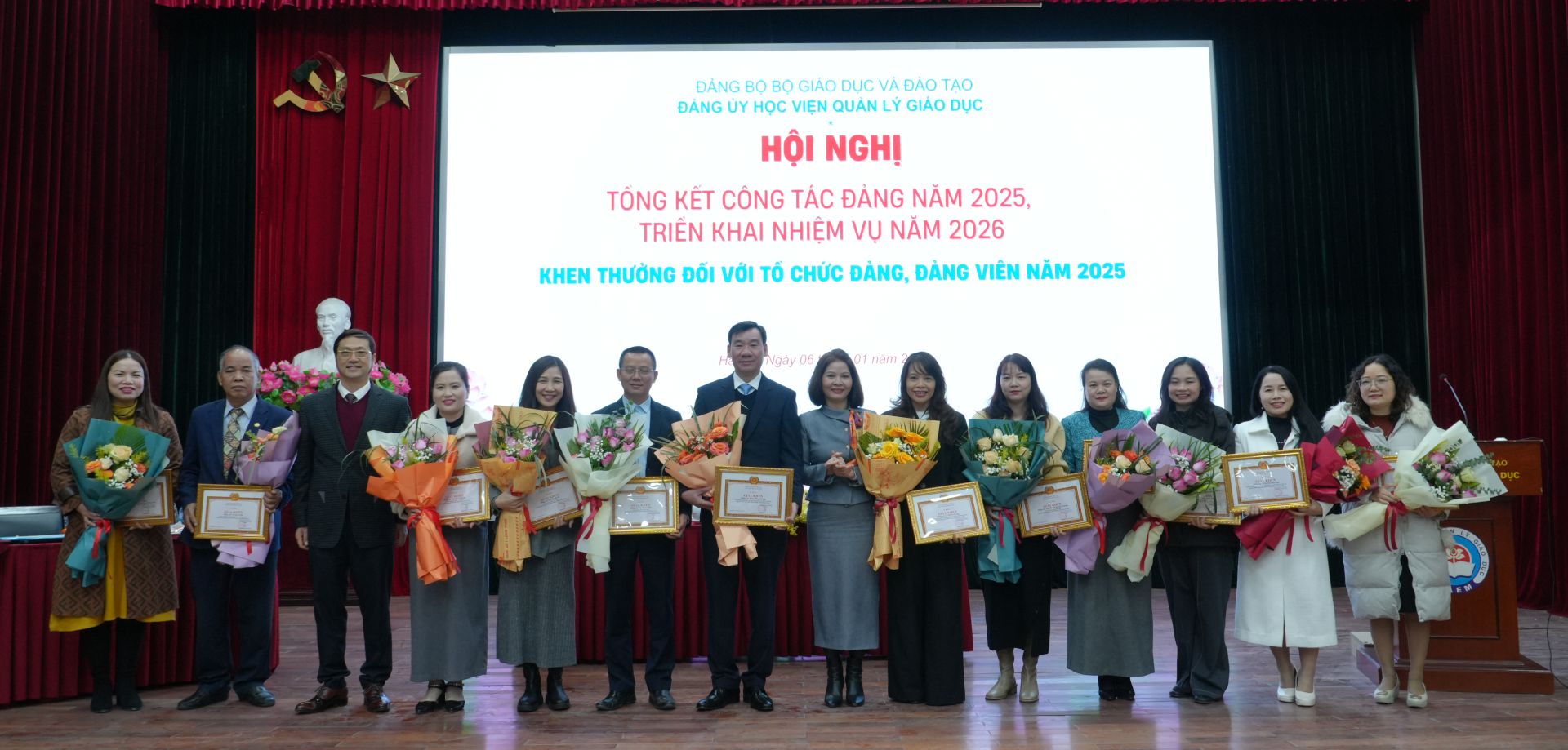 Đảng bộ Học viện đã trao tặng giấy khen cho 02 chi bộ và 03 đảng viên hoàn thành xuất sắc nhiệm vụ trong năm, đồng thời tặng giấy khen đột xuất cho 01 chi bộ và 08 đảng viên do có thành tích xuất sắc trong thực hiện nhiệm vụ phục vụ Đại hội Đảng bộ Học viện Quản lý giáo dục nhiệm kỳ 2025 – 2030.