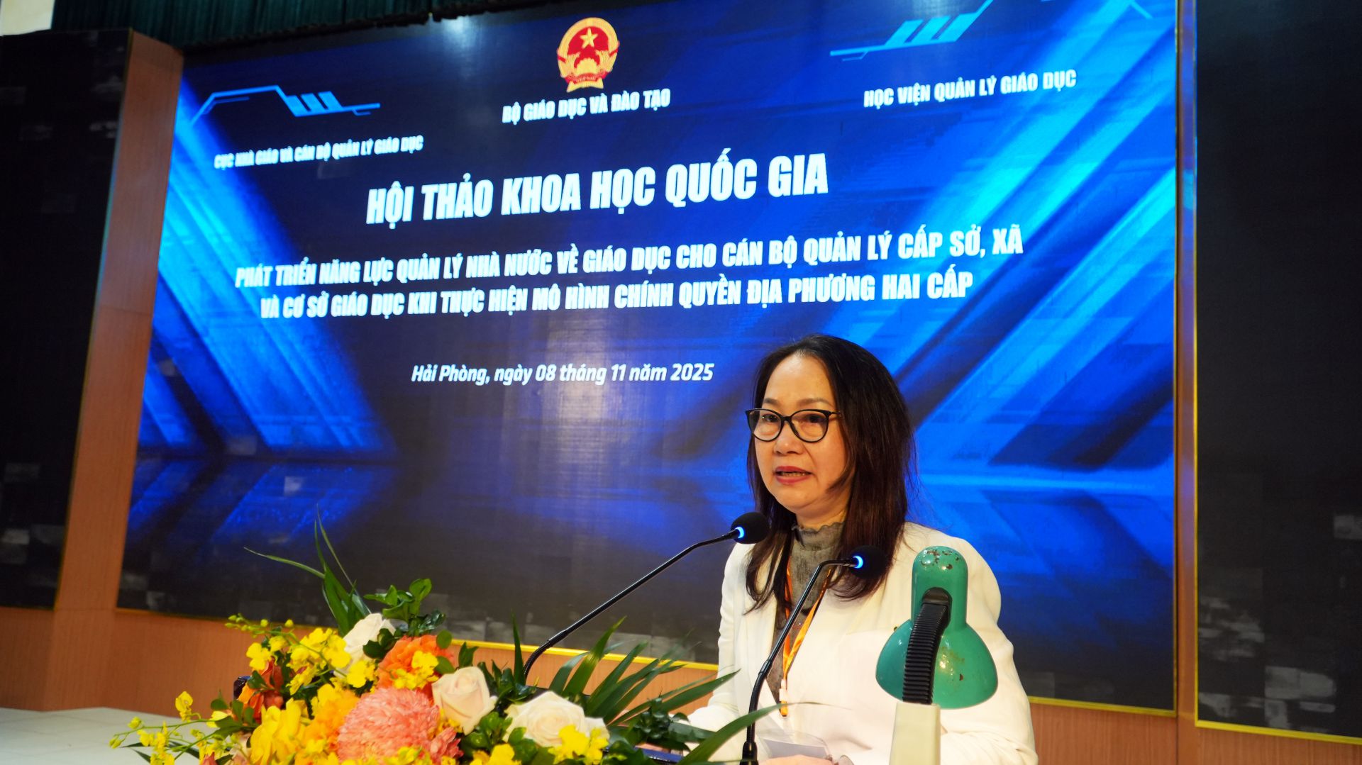 PGS. TS Nguyễn Thị Thu Hằng, Chủ tịch Hội đồng trường Học viện Quản lý Giáo dục phát biểu: Khi trực hiện chính quyền địa phương hai cấp, đây là cơ hội cũng như là thách thức của cả hệ thống chính trị trong đó có ngành giáo dục, đặc biệt là cán bộ, công chức phụ trách văn hóa, giáo dục cấp sở và cấp xã, phường, vì họ phải thực hiện công việc trong một điều kiện mới về thể chế, với nhiều chức năng, nhiệm vụ mới. Học viện có gần 50 năm thực hiện nhiệm vụ nghiên cứu, xây dựng các chương trình đào tạo, bồi dưỡng đội ngũ CBQLGD các cấp, do đó trong thời gian tới sẽ tiếp tục thực hiện nhiệm vụ quan trọng này để tham mưu cho Bộ GDĐT trong xây dựng và ban hành các văn bản quản lý nhà nước về quản lý giáo dục cũng như xây dựng các chương trình bồi dưỡng nâng cao năng lực cho đội ngũ CBQLGD các cấp đáp ứng yêu cầu đổi mới giáo dục trong bối cảnh thực hiện chính quyền địa phương hai cấp.