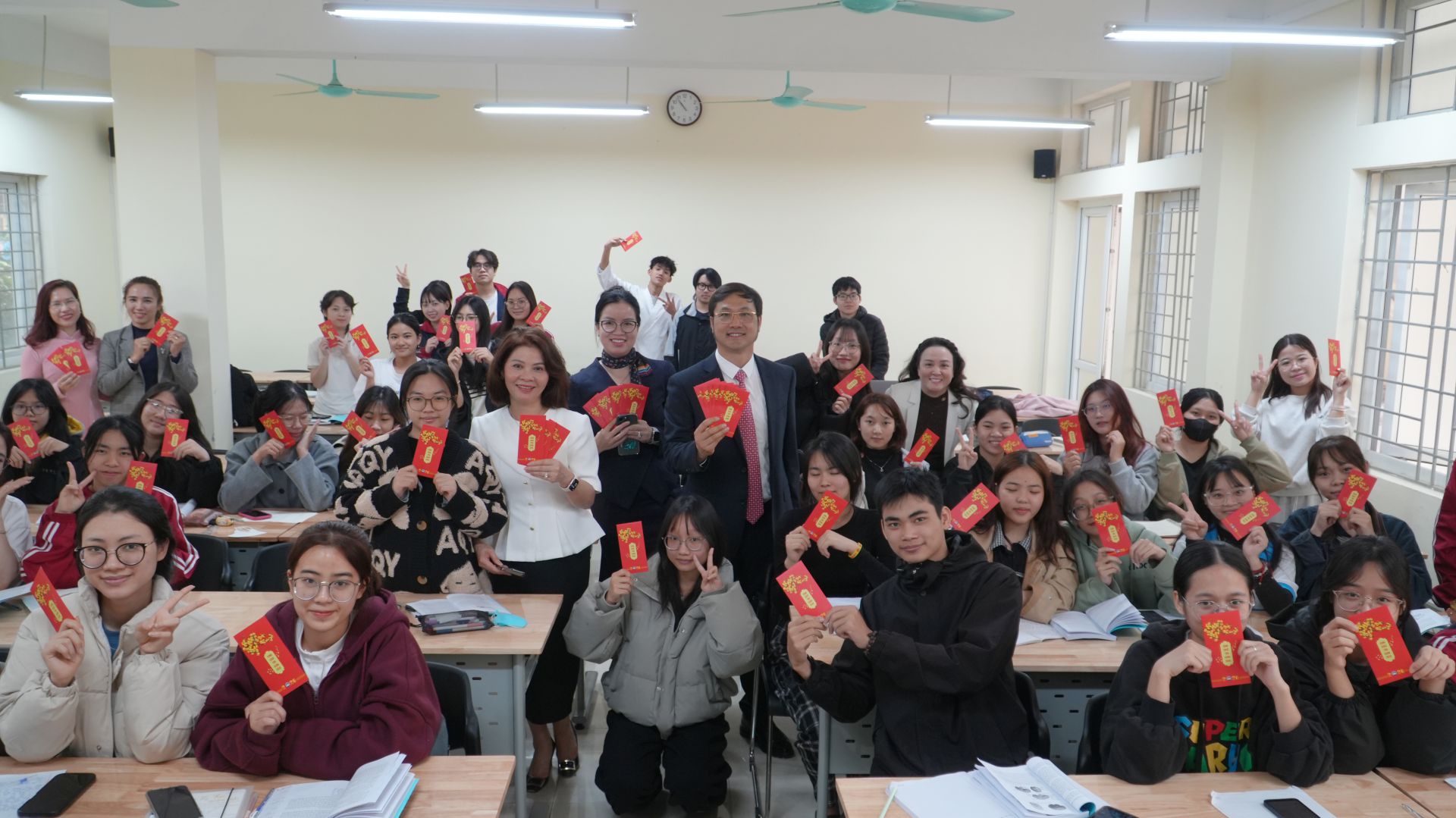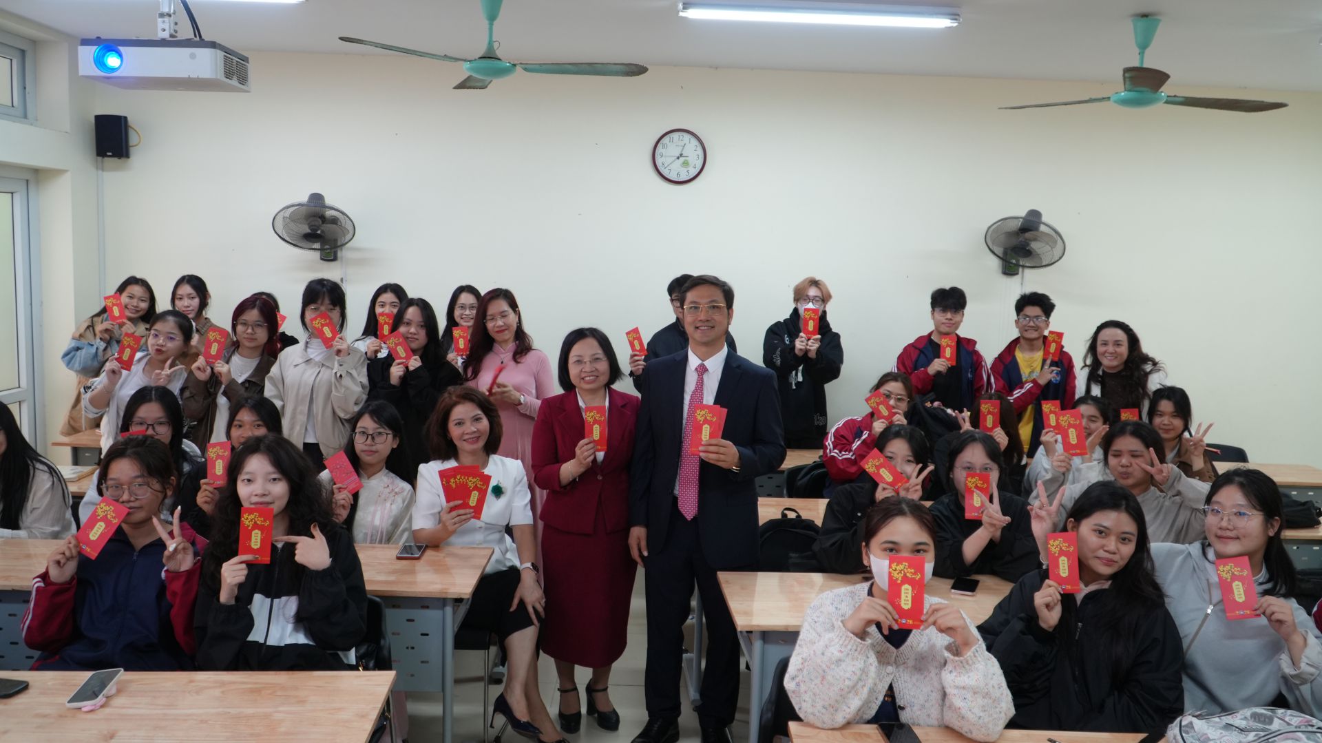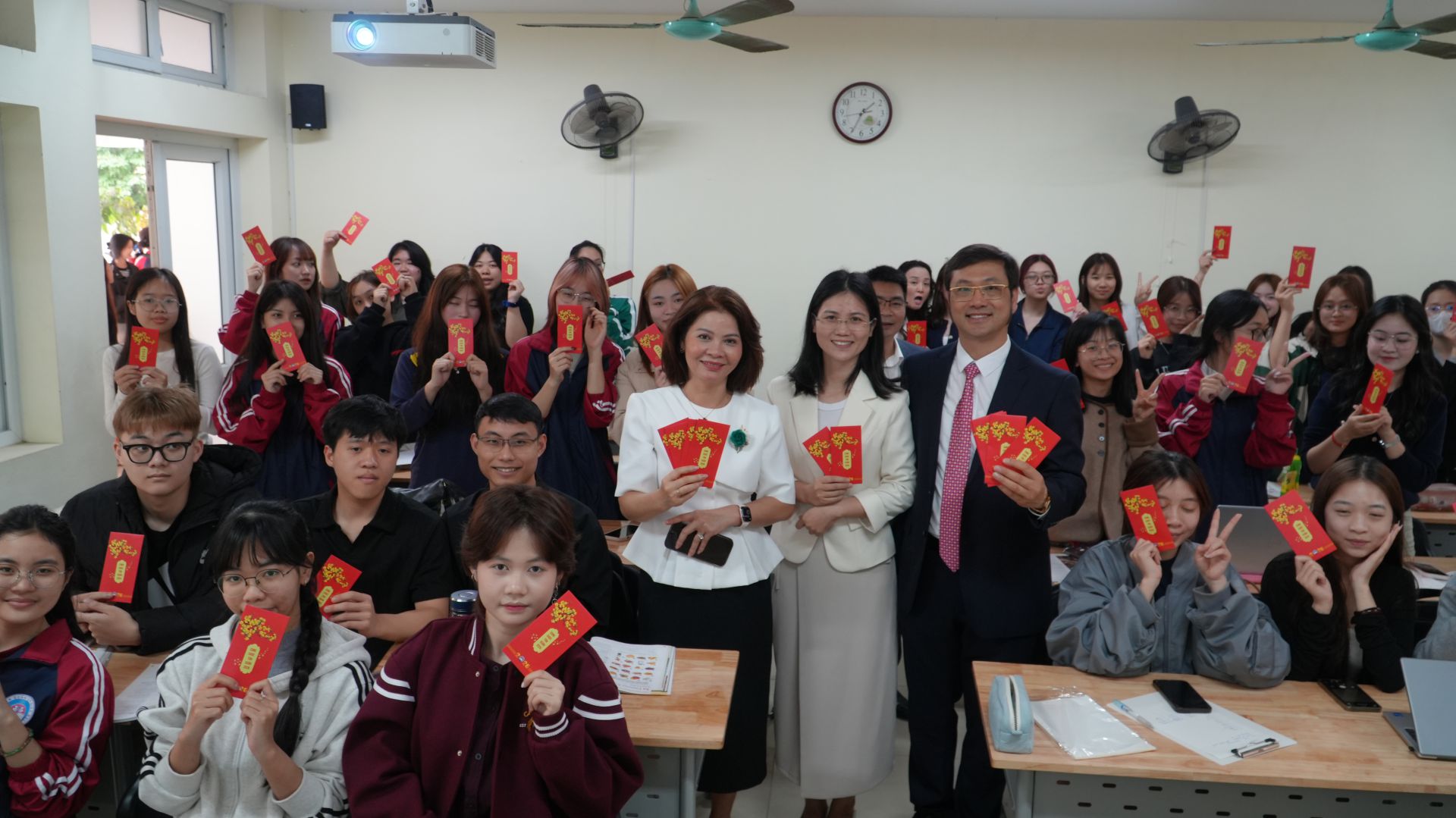 Cũng trong sáng ngày 23/02/2026, thay mặt cho tập thể sư phạm của Học viện, PGS.TS Nguyễn Thị Thu Hằng, Bí thư Đảng ủy Học viện, PGS.TS Phạm Văn Thuần, Giám đốc Học viện, TS. Phùng Thị Lý Hằng Phó Giám đốc Học viện, ThS Nguyễn Mạnh Cường Bí thư Đoàn TNCS Hồ Chí Minh; TS. Hoàng Thị Kim Huệ, Phó trưởng phòng, phụ trách Phòng Quản lý đào tạo - Giáo dục chính trị và công tác sinh viên đã gặp mặt và chúc Tết các thầy giáo, cô giáo và đặc biệt là các bạn sinh viên trong buổi học đầu tiên của năm mới Bính Ngọ 2026 với mong muốn các bạn sinh viên sẽ cố gắng học tập, rèn luyện để đạt được nhiều thành tích trong học tập, chuẩn bị tốt cho hành trang lập nghiệp; đồng thời cũng mong các bạn sinh viên luôn vui vẻ, tích cực tham gia các hoạt động đoàn và phong trào thanh niên do Đoàn Thanh niên Học viện tổ chức để có thêm nhiều kỷ niệm đẹp, lưu lại nhiều dấu ấn, hình ảnh về tuổi “Thanh Xuân” khi đang học tập và rèn luyện tại Học viện Quản lý giáo dục.