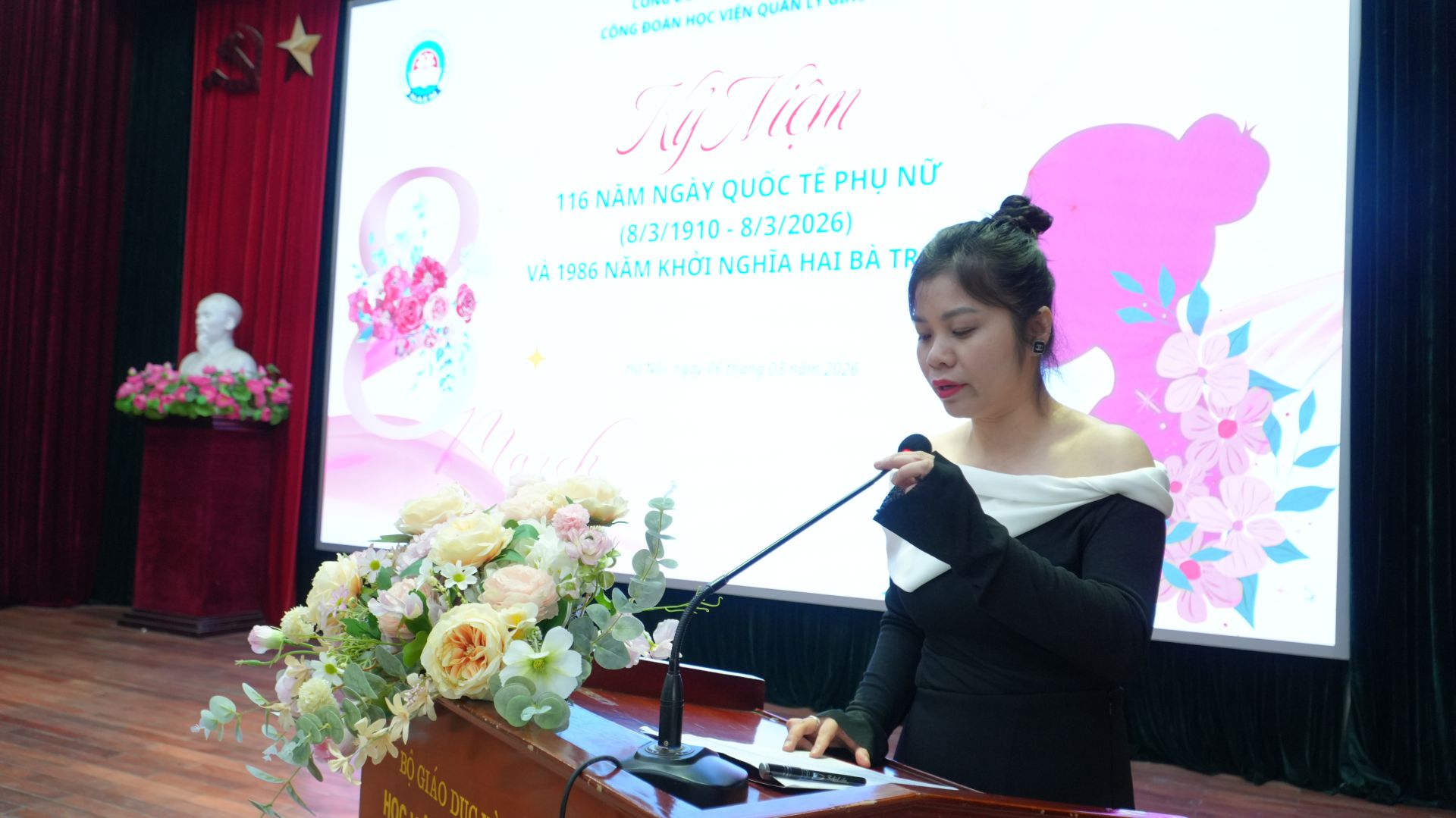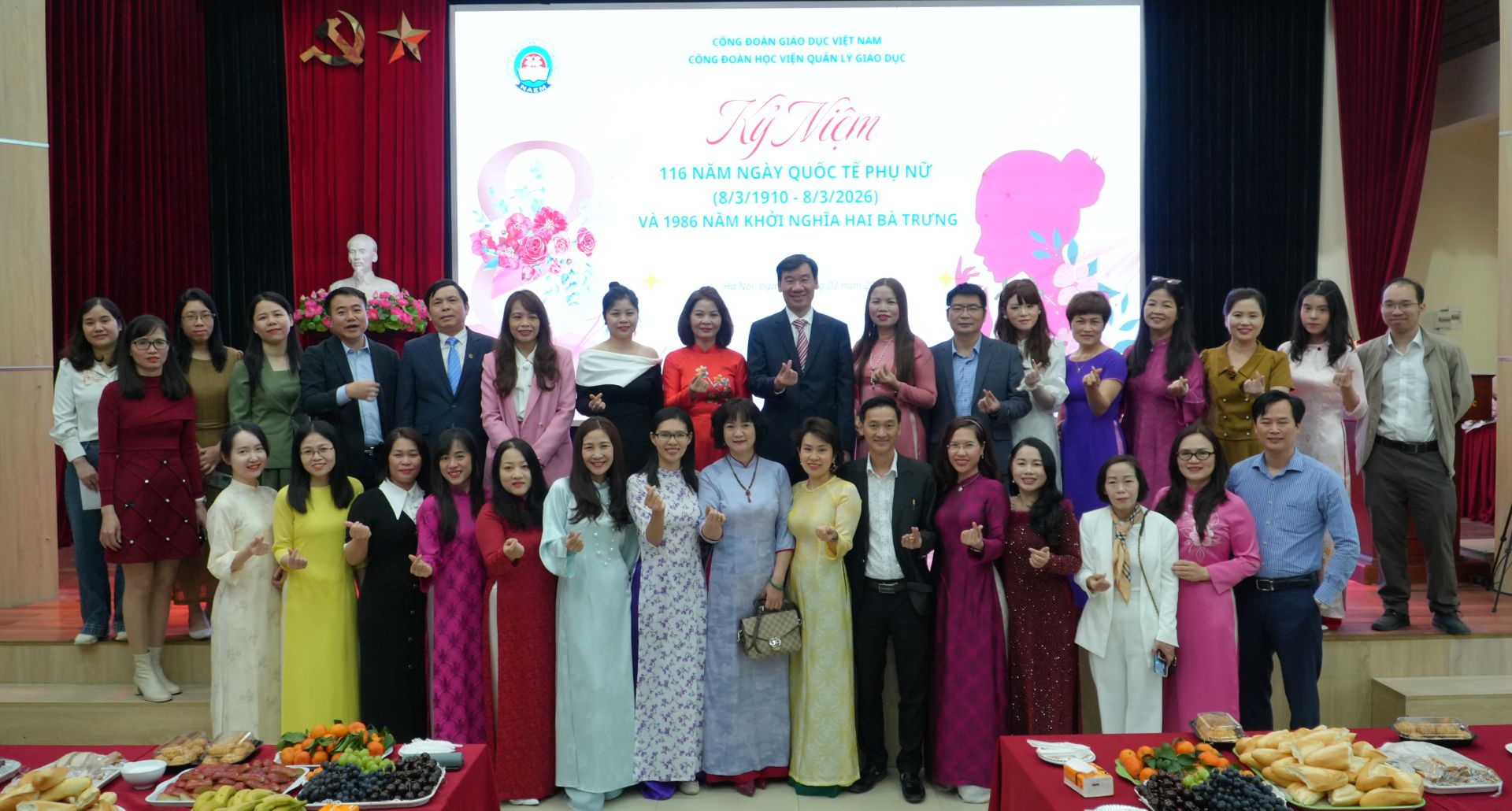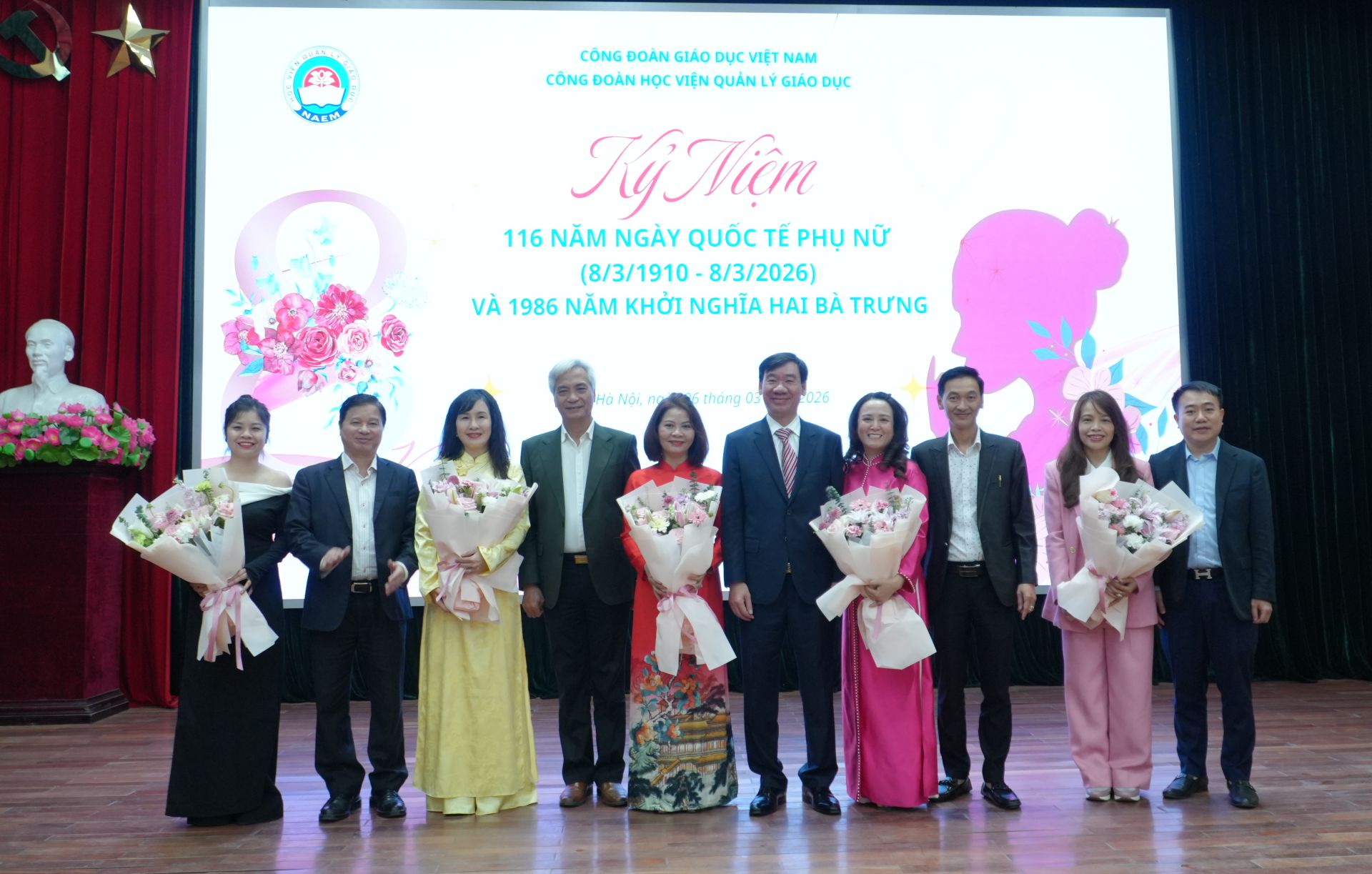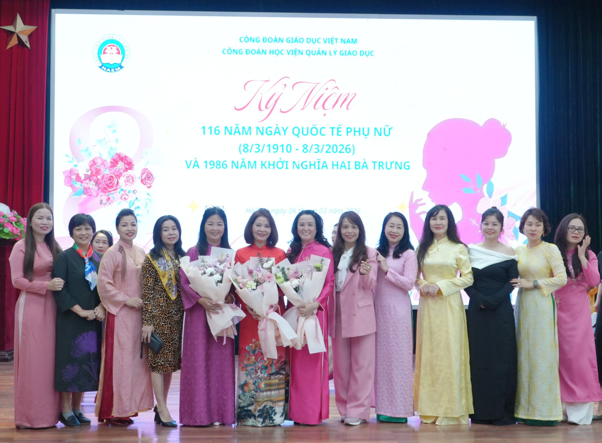 Sáng ngày 06/3/2026, trong không khí vưi tươi của Tiết Xuân Bính Ngọ, Công đoàn Học viện và Ban Nữ công Công đoàn Học viện Quản lý giáo dục long trọng tổ chức Kỷ niệm 116 năm Ngày Quốc tế phụ nữ 08/3/1910 – 08/3/2026 và 1986 năm khởi nghĩa Hai Bà Trưng để khẳng định và tôn vinh những đóng góp quan trọng của nữ giới cho sự tiến bộ, văn minh của thế giới nói chung, của nữ giới Việt Nam nói riêng và đặc biệt là sự đóng góp của tất cả nữ công đoàn viên của Học viện cho sự phát triển của Học viện Quản lý giáo dục trong 50 năm qua.