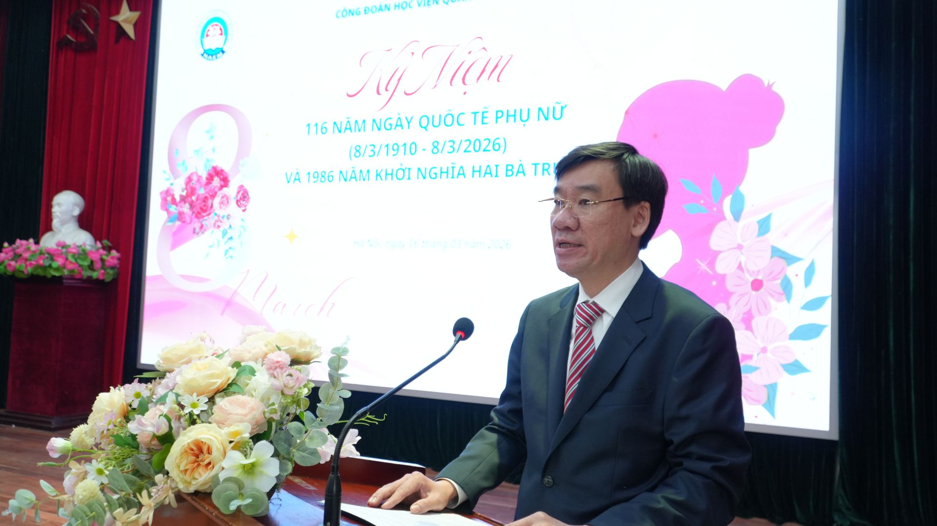 Thay mặt tập thể lãnh đạo Học viện, TS Phan Hồng Dương, Phó Giám đốc Học viện đã phát biểu: Ngày Quốc tế phụ nữ 8/3 bắt nguồn nguồn từ phong trào đấu tranh đòi quyền lợi của các công nhân dệt may tại Mỹ vào cuối thế kỉ XIX. Vào ngày 8/3/1899 tại Chicago và New-York đã nổ ra cuộc đấu tranh mạnh mẽ của nhiều công nhân nữ dành quyền lợi, đòi tăng lương và giảm giờ làm. Ngày 26 và 27/08/1910, đại hội lần thứ 2 của những người phụ nữ được triệu tập tại Copenhagen thủ đô Đan Mạch và quyết định lấy ngày 8/3 làm ngày Quốc tế Phụ nữ nhằm mục đích đấu tranh đòi quyền lợi cho họ và trẻ em. Với khẩu hiệu: Ngày làm việc 8 giờ, công việc ngang nhau, tiền lương như nhau. Từ đó cho đến nay ngày 8/3 đã trở thành ngày Quốc tế Phụ nữ, là ngày phụ nữ trên thế giới đấu tranh đòi quyền tự do, bình đẳng, hòa bình, hạnh phúc.