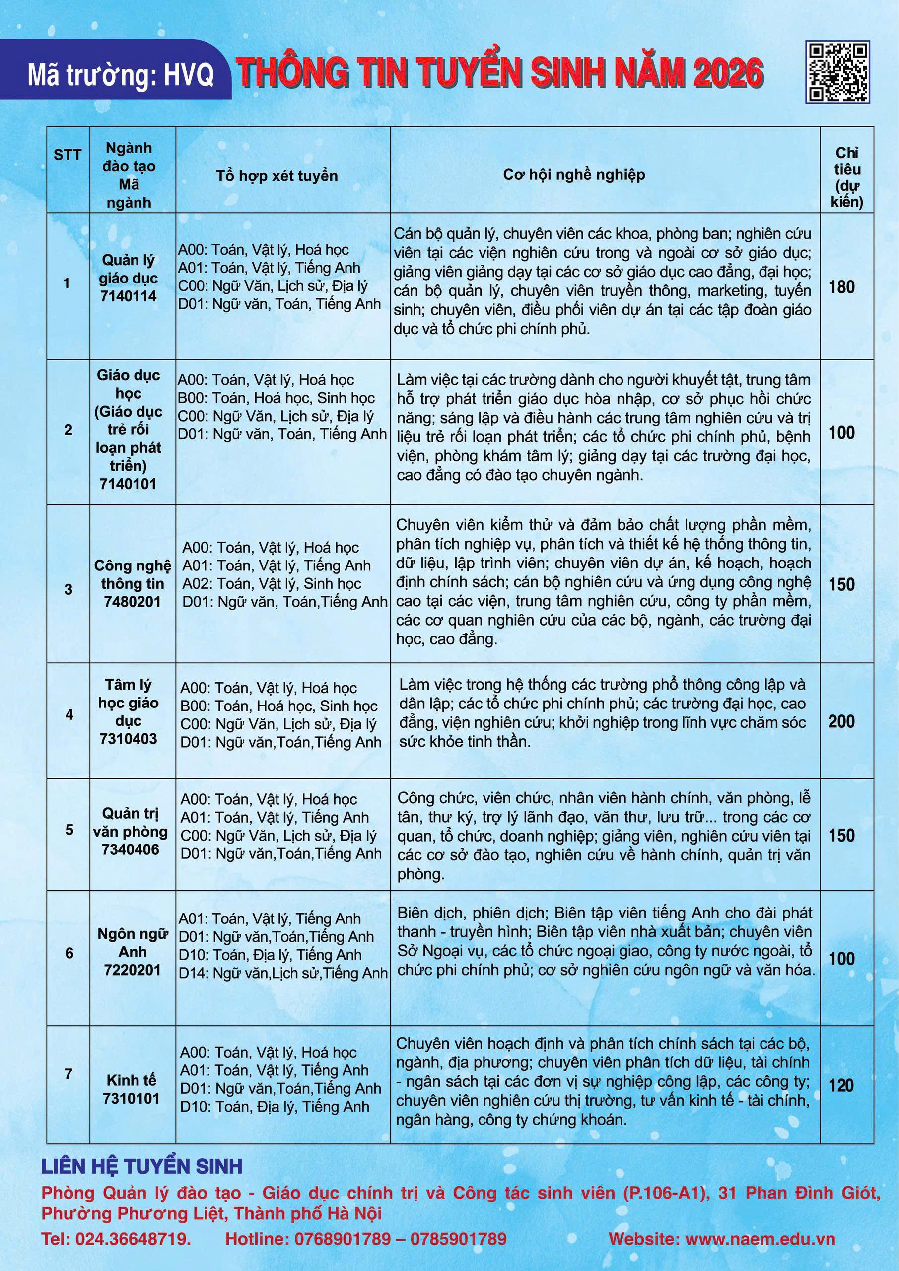 THÔNG TIN TUYỂN SINH NĂM 2026 – HỌC VIỆN QUẢN LÝ GIÁO DỤC
